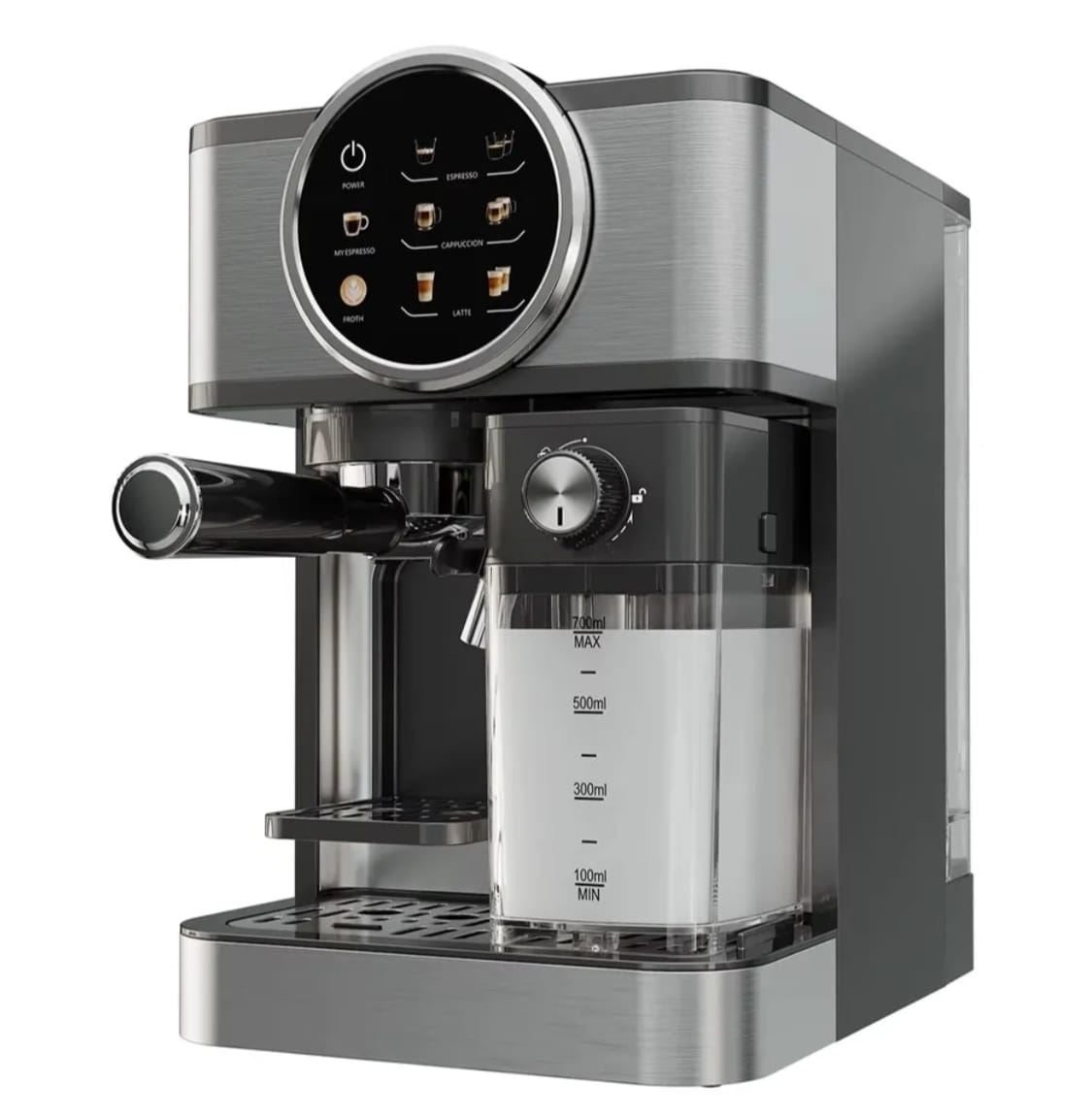 MACCHINETTA DA CAFFE' Prepara il caffè con un semplice clic. Per preparare di tutto, dall'espresso al cappuccino, in modo intuitivo e veloce. Latte macchiati spumosi. Serbatoio del latte da 500 ml e schiumatore per preparare il tuo caffè o cappuccino. Più caffè con meno rifornimenti d’acqua. Serbatoio dell'acqua rimovibile da 1,5 L per gustare caffè perfetti ogni giorno senza doverlo riempire continuamente. Inoltre, il suo design rimovibile ne facilita il riempimento. Fino a 2 caffè alla volta. Braccio con doppio erogatore per preparare due caffè contemporaneamente, risparmiando tempo senza perdere efficienza nella preparazione. Design elegante e resistente. Design in acciaio di colore scuro e plastica. Pulizia facile. Vaschetta raccogligocce rimovibile per eliminare facilmente i residui di caffè. Tempera le tazze. Superficie scalda-tazze che mantiene la tazza alla temperatura perfetta